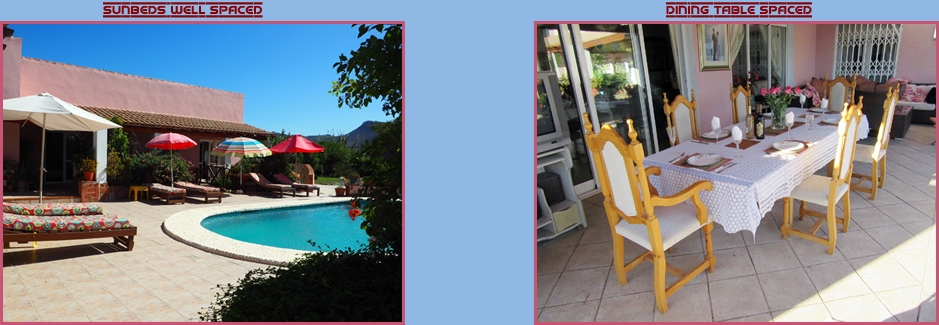 Our totally fenced and screened pool and garden area give you the utmost seclusion and confidentiality, allowing you a completely relaxed atmosphere to be totally liberated. Our home is newly built, and all rooms are available to clients, although we hope you will spend most of your time with us relaxing in the gardens and by the pool, you are welcome to use our comfortable lounge to relax in. We offer four double rooms each with en suite luxury bathroom. Poolside rooms are equipped with full air conditioning. One adjacent room has its own private garden with BBQ area and terrace. Our latest room has its own terrace area. Each room has its own fridge, tea & coffee making facilities as well as T. V. and DVD player. You may use our FREE WiFi anywhere within the complex so should you wish you can stay in touch with the outside world!